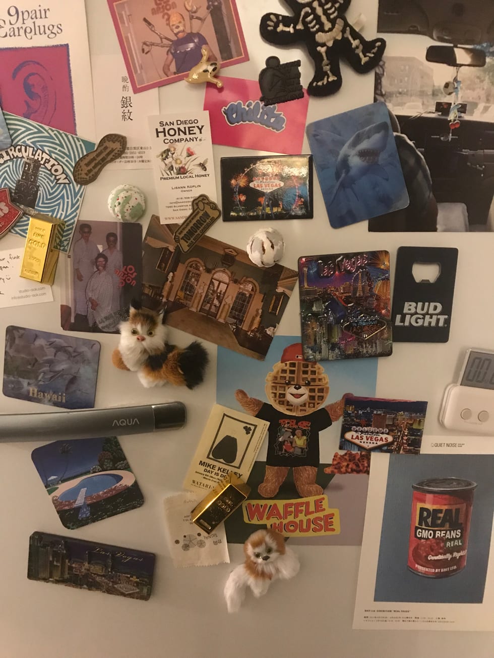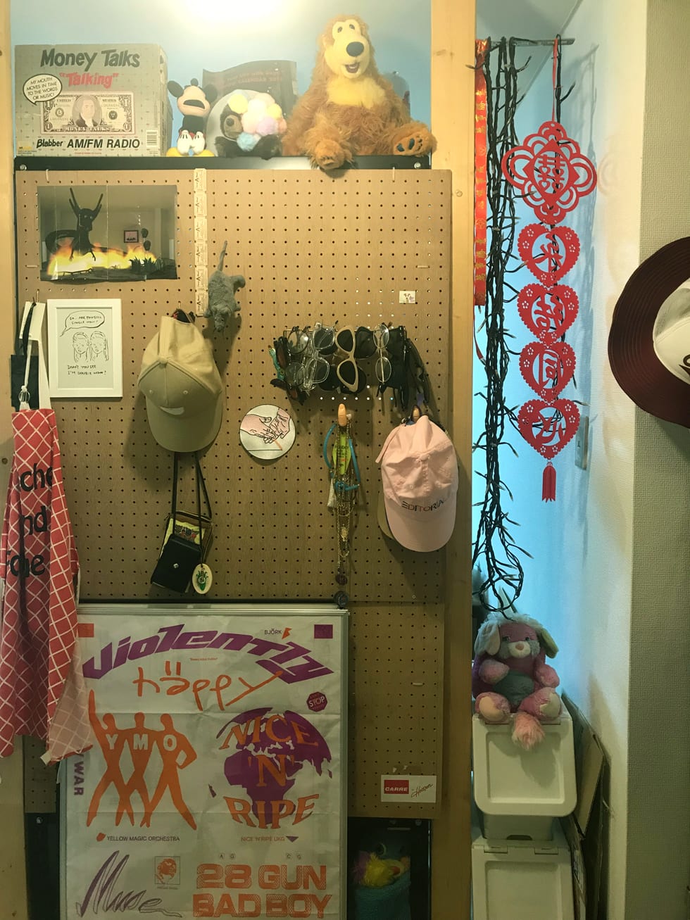 DIYで作ったこちら通称・掲示板。壁を傷つけることを心配しなくてOKなので、その時気に入ったものをそのまま貼ったり飾ったりする場所。fukinのドラゴン、DEADKEBABのクレアちゃんの作品、BOOTBOYZのポスターとか。