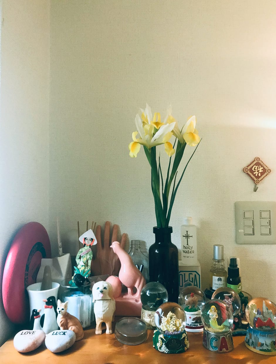 玄関開けてすぐ、棚の上にもらったものをまとめてディスプレイ。手前にあるのは各国のスノードームたち。両親が海外に行くたびにお土産を悩むと言うので、数年前からお願いしている。親は悩まない、私嬉しい。ウィンウィンの関係。なぜかその噂を聞きつけて、実家ご近所の奥様まで私にスノードームを買ってきてくれた(笑)。
