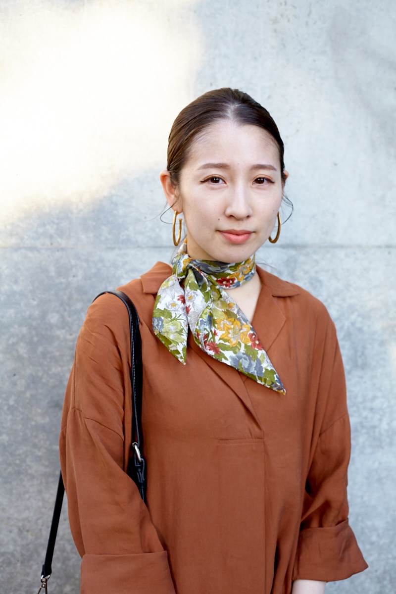 今日は、気温が高いこともあり、ゆるい雰囲気で楽ちんな感じのコーディネートにしています。色だけ、統一感を持たせたので、ぱっと見はラフすぎないはず(笑)。スカーフにはまっていて、さし色にしたり、全体に馴染ませたり。コーディネートのお役立ちアイテムです。