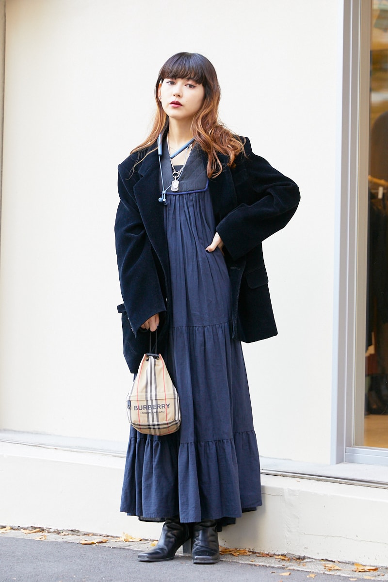 ダークカラーのべルヴェットがクール。ジャケットとワンピのギャップがいい塩梅|365日おしゃれスナップ