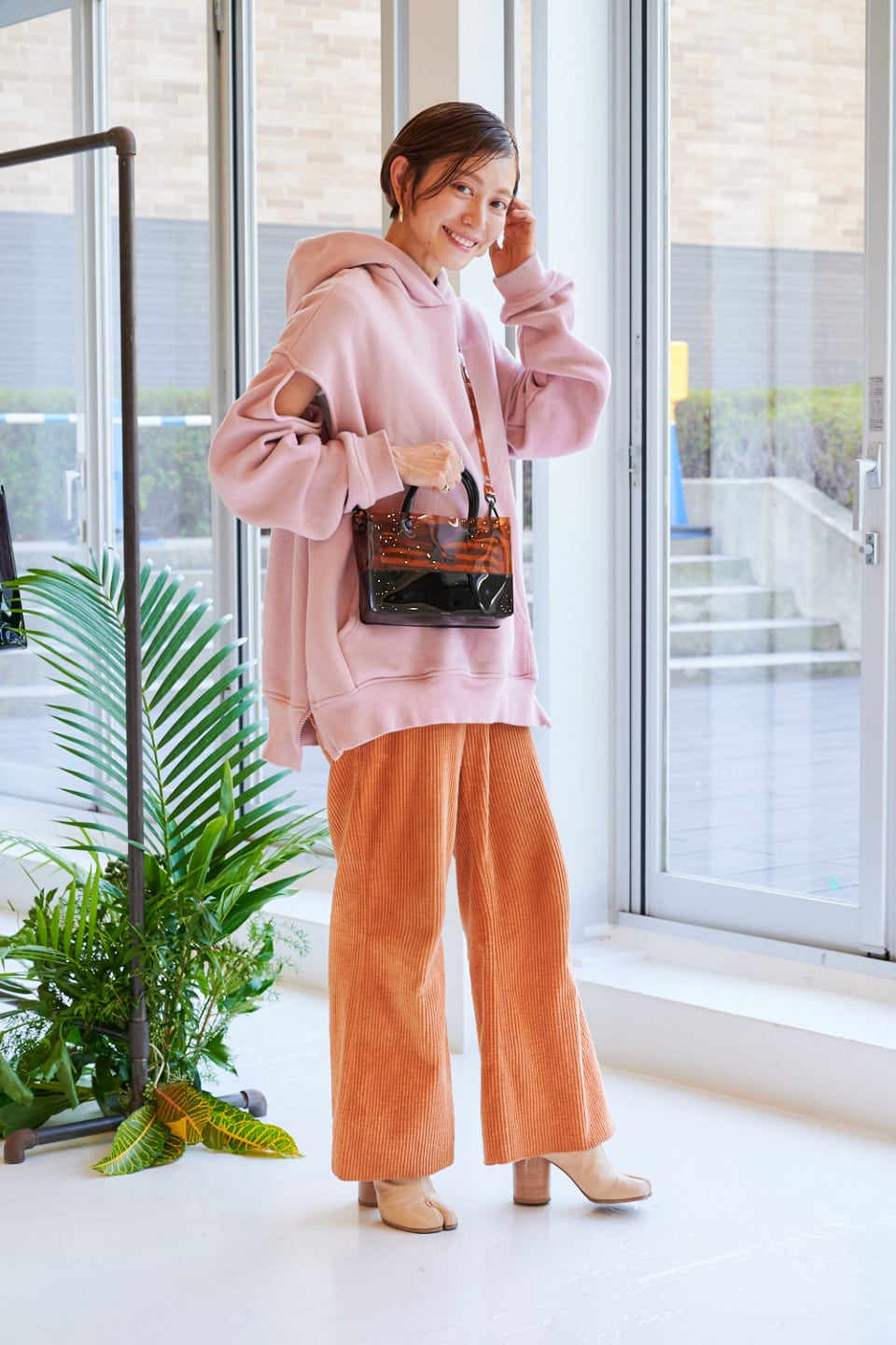 ピンクがかわいいスウェットパーカーにオレンジ色のコーデュロイのパンツを合わせて。バッグは茶色を選んで同系色でまとめました。