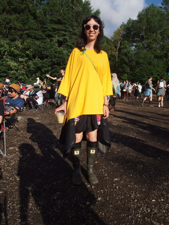 黄色一色で勝負!その直球さが素敵だった彼女は大阪府から参戦。Tシャツの袖がここ一番のドロップショルダーなのもポイント。ちらっと覗くポンポン付きのベルトも可愛かった。ベージュのセルフレームのサングラスもセンスが光る。